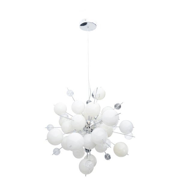 Diese Pendelleuchte aus unserer EXPLOSION-Kollektion wird Sie begeistern! Mit Pendelleuchten erhalten Sie eine direkte und zielgerichtete Beleuchtung, die optimal für die Beleuchtung von Esstischen, Kücheninseln, Arbeitsbereichen oder anderen Bereichen geeignet ist, die eine konzentrierte Lichtquelle benötigen. Sie akzentuieren bestimmte Zonen und schaffen eine klare Lichtquelle für alltägliche Aufgaben. Der Look dieser Lampe im Modern Style wird durch ihre kugelförmige Gestaltung gekonnt unterstrichen. Optimal für alle, die es extravagant und edel mögen! Die Leuchte aus Metall und Glas in weiß ist ein Blickfang in jedem Raum.. Das verchromte Gestell und der klar-transparente Schirm ergeben eine stimmige Einheit und ein stilvolles Gesamtbild. Die Pendelleuchte misst 65 cm in der Länge, 65 cm in der Breite/Tiefe und 193 cm in der Höhe. Die Leuchte hat also einen Durchmesser von 65 cm. Sie können die Pendellänge zwischen 65 und 193 cm einstellen. Mit einer Länge von 150 cm bietet das klar/transparente Kabel ausreichend Spielraum. Diese Pendelleuchte ist die ideale Lösung für die unterschiedlichsten Beleuchtungsanforderungen. Dank der G9 Fassung steht Ihne eine große Auswahl an Leuchtmitteln zur Verfügung. 10 der Fassungen sorgen für genügend Licht. Das Leuchtmittel können Sie selber wechseln. Diese Leuchte entspricht der Klasse 2. Dieses Gerät ist für den Netzbetrieb vorgesehen und wird mit einer Netzspannung von 220-240V ~ 50Hz betrieben. Die Leuchte hat eine Gesamtleistung von 280 Watt. Verleihen Sie Ihrem Zuhause mit unserer hochwertigen Pendelleuchte das perfekte Lichtambiente und genießen Sie Komfort und Stil in jedem Raum.