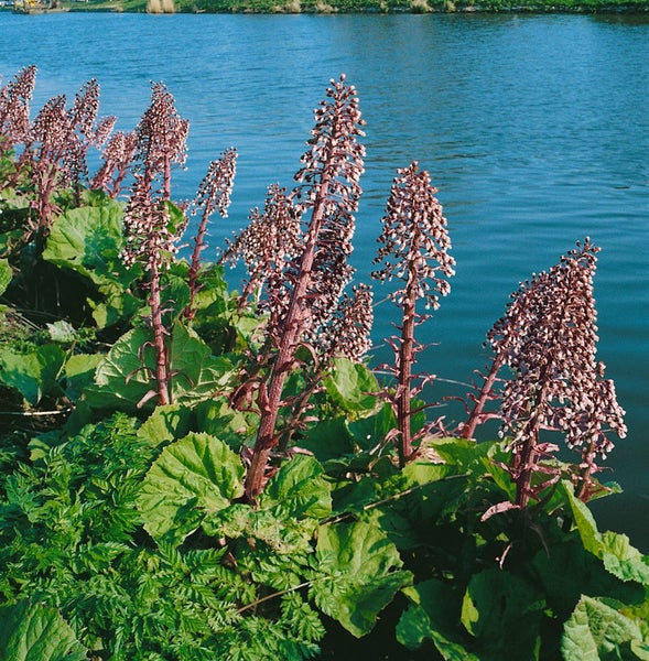 Petasites hybridus, die Gewöhnliche Pestwurz, ist eine eindrucksvolle Blattstaude mit außergewöhnlich großen, rundlichen Blättern, die im Sommer üppige, bodendeckende Teppiche bilden. Bereits sehr früh im Jahr, oft ab März, erscheinen vor dem Laubaustrieb kräftige, purpurrosa bis rosawhite Blütenköpfe auf stabilen Stielen, die dem Beet einen markanten, fast archaischen Charakter verleihen. Im Laufe der Saison entwickeln sich die bis zu schirmgroßen Blätter, die in halbschattigen bis schattigen Lagen für eine imposante, architektonische Wirkung sorgen und als lebendiger Kontrast zu filigranen Stauden überzeugen. Mit ihrem ausläuferbildenden Wuchs erweist sich die Pestwurz als kraftvoller Bodendecker, der besonders am Teichrand, entlang von Bachläufen, im Gehölzrand oder in großzügigen Schattenbeeten punktet. Als Solitär setzt sie wirkungsvolle Akzente, in Gruppenpflanzung schafft sie eine geschlossene, pflegeleichte Fläche; in sehr großen Kübeln oder mit Wurzelsperre lässt sich ihr Ausbreitungsdrang gut kontrollieren, wodurch auch Terrasse oder Vorgarten mit ausreichend Platz in den Genuss ihrer imposanten Blattschmuckwirkung kommen. Ein humoser, nährstoffreicher, dauerhaft frischer bis nasser Boden ist ideal, Staunässe wird bestens vertragen. Die Pflege beschränkt sich auf das Entfernen verblühter Stängel im Frühjahr, das Zurückschneiden alter Blätter und gelegentliche Teilungen zur Bestandslenkung. Eine gleichmäßige Wasserversorgung und eine Laubmulchdecke fördern Vitalität und Blattgröße. Robust und langlebig bereichert Petasites hybridus naturnahe Pflanzungen, Schattenbereiche und Uferzonen als großblättrige Schmuckstaude mit eindrucksvollem Habitus.
