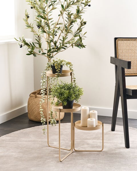 Dekorative Pflanzenständer. Dieser elegante und vielseitige Pflanzenständer mit seinem unverwechselbaren dreistufigen Design eignet sich perfekt für die Präsentation von Pflanzen, Kerzen oder dekorativen Akzenten. Die zeitlose beige Farbe und der minimalistische Rahmen sorgen für einen schlichten, modernen Look. Mit seiner offenen Struktur bietet dieser Ständer unendliche Möglichkeiten für kreative Arrangements und passt sowohl in moderne als auch in traditionelle Einrichtungen. Ob als Pflanzenständer oder als dekorativer Tisch, er verleiht jedem Raum funktionale Eleganz. Details: Typ Indoor Blumentopf. Farbe: Beige. Material: Metall. Material: Eisen. Form: Rund. Abflusslöcher am Boden: Nein. Finish: Pulverbeschichtet. Innentopf benötigt: Ja. Volumen: 1. Abmessungen: Tiefe: 21 cm. Breite: 42 cm. Höhe: 60 cm. Gewicht: 1.5 kg. .Sie kaufen: 1 x Pflanzenständer. Produktvorteile: Wunderbar geeignet für Schlaf- und Wohnbereich, Dekorativ und zugleich funktional, Elegante Optik, Platzsparend zusammenklappbar, Leichtes Gewicht und gut transportierbar, Multifunktional. Montage: Teilweise montiert.5 - 15 Min. Beständigkeit: Rostbeständig. Beständigkeit Text: Dank eines entsprechenden Finish zeichnet sich das Produkt Oberfläche durch eine Rostbeständigkeit aus. Dies bedeutet, dass es im Freien genutzt werden kann. Werden die Möbel nicht genutzt, sollte entweder eine Abdeckung verwendet oder sie sollten an einem trockenen Ort gelagert werden. Pflegeanleitung: Eisen: 1.Bitte ausschließlich handelsübliche, milde Reinigungsmittel und weiche Tücher verwenden, wobei feuchte Stellen sofort trocken gerieben werden sollten. 2.Vermeiden Sie scheuernde Reiniger, da diese die Oberfläche beschädigen können. 3.Bei Chrom und Kupfer regelmässig mit speziellen Pflegemitteln polieren. 4.Bitte beachten Sie, dass das Produkt wetterempfindlich ist und bei Nichtgebrauch im Inneren aufbewahrt werden sollte.
