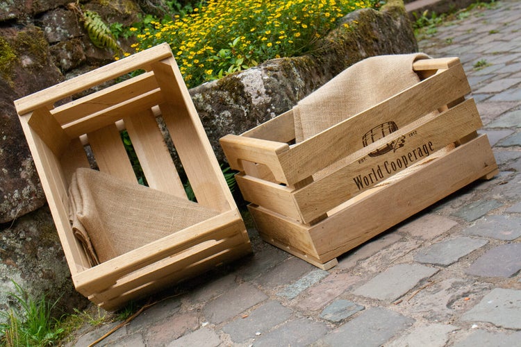 Pflanzkiste aus den Dauben von Weinfässern inkl. Jutestoff der vor der Bepflanzung in die Kiste gelegt wird.
