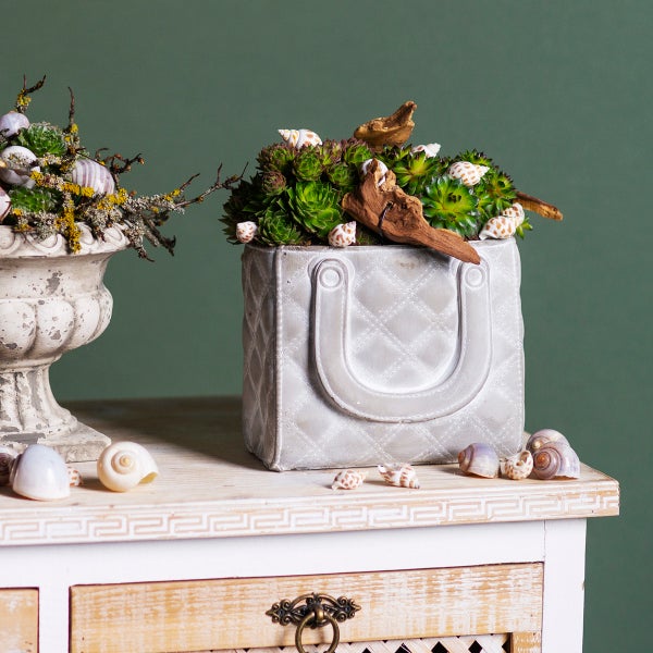 Stilvolle Dekoration für Ihr Zuhause Verleihen Sie Ihrem Wohnbereich oder Balkon mit unserem Pflanzkübel aus Beton einen Hauch von Eleganz! Dieser in Handtaschenform designte Übertopf ist das perfekte Accessoire für trendbewusste Pflanzenliebhaber und lädt dazu ein, kreativ zu werden. Exklusives Design Kunstvoll nachgebildete Nähte und fein gewischte Details heben dieses Gefäß in die Luxusklasse. Nutzen Sie den Kübel als einzigartigen Blickfang in Ihrem Zuhause – sei es auf dem Tisch oder auf der Fensterbank. Vielseitige Dekorationsmöglichkeiten Kombinieren Sie den Pflanzkübel mit Künstlichen Rosen oder Lavendelzweigen von uns, um eine romantische Atmosphäre zu schaffen. Für eine sommerliche Tischdeko empfehlen sich Trockenblumen oder ein Steckschaumziegel als Basis für kreative Arrangements. Praktische Tipps Vor dem Bepflanzen empfehlen wir, den Topf mit Folie auszulegen, um Feuchtigkeitsverlust zu vermeiden. Entdecken Sie auf unserem Unternehmen weitere passende Deko-Artikel, die sich perfekt mit diesem luxuriösen Pflanzkübel ergänzen. Anb.Nr.: 14970 EAN: 4067555149703