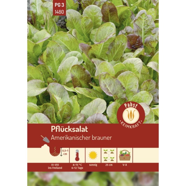 Pflücksalate bilden keinen Kopf, sie können je nach Bedarf Blatt für Blatt von außen geerntet werden und wachsen weiter, wenn das Salatherz bei der Ernte nicht verletzt wird. Die spätschossende Sorte mit großen, braun-roten, gewellten Blättern kann vom Frühjahr bis in den Sommer etappenweise ausgesät und geerntet werden.