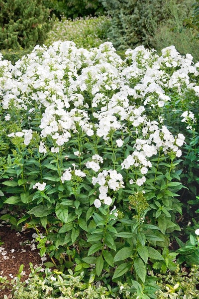 Phlox paniculata ‘Danielle’, die Flammenblume bzw. Garten-Phlox, ist eine elegante Sommerstaude mit üppigen, reinweißen Blütenrispen und zartem Duft. Die Sorte überzeugt mit aufrechtem, horstigem Wuchs, dunkelgrünem, lanzettlichem Laub und einer langen Blütezeit von Juli bis September. Die großen, dicht besetzten Dolden bringen Leuchtkraft in Staudenbeet und Rabatte und setzen als Duftstaude ebenso wie als Schnittblume strahlende Akzente. Mit einer Endhöhe von etwa 80 bis 100 cm und einer Breite von 40 bis 60 cm eignet sich diese Blütenstaude ideal für die mittlere Beetzone, harmoniert mit Ziergräsern und klassischen Begleitern wie Rittersporn, Sonnenhut oder Taglilien und wirkt in Gruppenpflanzung ebenso eindrucksvoll wie als Solitär im Vorgarten. Als Kübelpflanze kommt sie auf Terrasse oder Balkon zur Geltung, sofern das Gefäß ausreichend Platz und gleichmäßige Wasserversorgung bietet. Ein sonniger bis halbschattiger Standort fördert reiche Blütenbildung; der Boden sollte humos, nährstoffreich, frisch bis gleichmäßig feucht und gut durchlässig sein. Regelmäßiges Wässern in Trockenphasen und eine Mulchschicht halten die Feuchtigkeit, ohne Staunässe zu begünstigen. Leichter Rückschnitt verblühter Dolden verlässt die Blütezeit, während ein bodennaher Rückschnitt im Herbst oder zeitigen Frühjahr die Vitalität unterstützt. Für dauerhaft dichte Horste empfiehlt sich das Teilen älterer Pflanzen alle paar Jahre. Mit ihrer standfesten, gesunden Erscheinung und dem reinen Weiß ihrer Blüten ist Phlox paniculata ‘Danielle’ eine vielseitige Gartenstaude für Bauerngarten, Naturgartenoptik, Randbepflanzung und repräsentative Beete.
