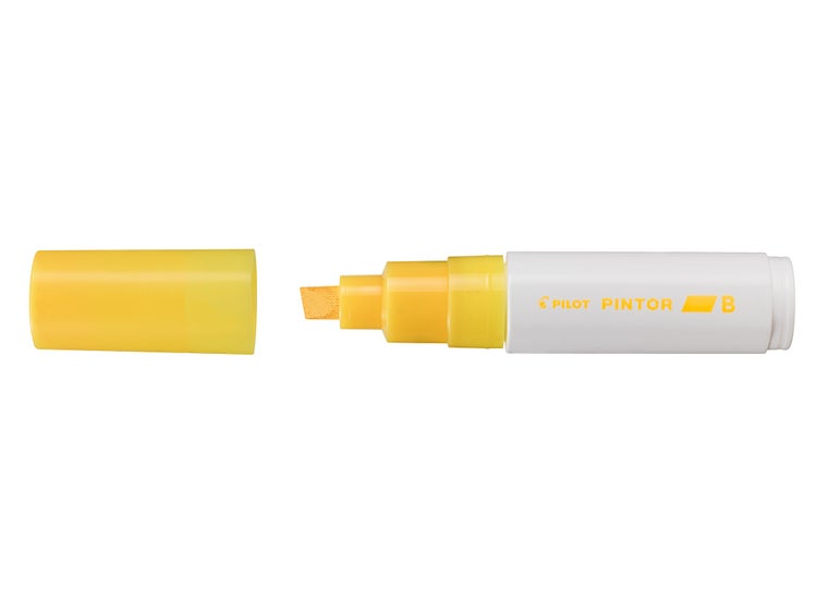 Kreativmarker PINTOR B in neuen Neonfarben. Geeignet für kreative Zwecke, egal ob für Profis oder Hobbykünstler. Markiert, schreibt, zeichnet und malt in 30 Farben. Mit pigmentierter, geruchsarmer Tinte auf Wasserbasis. Gut deckende, schnell trocknende Tinte. Lichtdurchlässig. Anwendbar auf fast allen Oberflächen: Papier, Karton, Holz, Metall, Kunststoff, Glas, Keramik, Porzellan und Textilien. Feucht abwischbar auf glatten Oberflächen. Für permanente Kreationen Fixierung mit Fixativ (bspw. matter Acryl-Sprühlack) nötig. Vor der Nutzung kräftig schütteln und anpumpen, bis Tinte fließt. Mit Spitze nach oben aufbewahren. Keilspitze in B (8,0 mm). Strichbreite: max. 8,0 mm. Kappenfarbe = Kolorierfarbe. Kolorierfarbe: Neonapricot.
