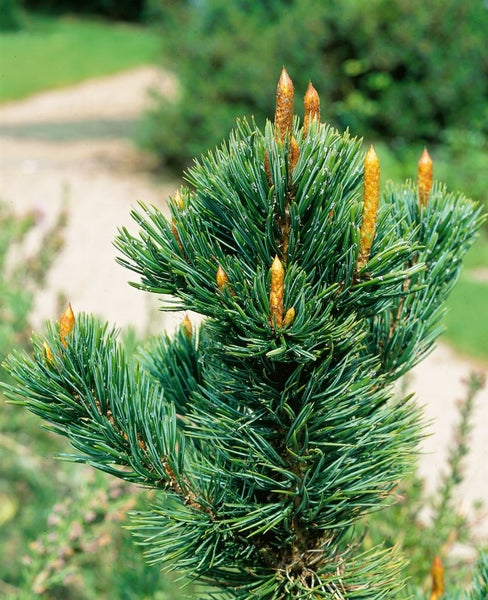 Pinus aristata, die Borstenkiefer, ist ein außergewöhnliches Nadelgehölz mit hohem Zierwert, das als immergrüne Kiefer rund ums Jahr Struktur und Farbe in den Garten bringt. Ihre dicht stehenden, blaugrünen Nadeln mit charakteristischen weißen Harzpunkten sitzen in Fünfernadeln und verleihen dem Laub eine edel schimmernde Optik. Der Wuchs ist sehr langsam, kompakt bis malerisch-knorrig und entwickelt mit den Jahren eine charaktervolle Silhouette, die als Solitär im Vorgarten oder im Staudenbeet sofort ins Auge fällt. Im späten Frühjahr erscheinen unscheinbare Blüten, aus denen dekorative, bräunliche Zapfen reifen; die namensgebenden „Borsten“ an den Schuppen sorgen für einen markanten, naturnahen Eindruck.