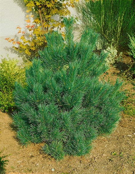 Pinus cembra ‘Nana’, die Zwerg-Zirbelkiefer (auch Arve genannt), ist ein besonders kompakter Vertreter des immergrünen Nadelgehölzes, der mit dichter, rundlich bis leicht kegelförmiger Wuchsform und angenehm blaugrünen, weichen Fünfernadeln überzeugt. Als langsam wachsende Zwergkonifere bildet sie im Laufe der Jahre ein harmonisches Kleingehölz, das Struktur und Farbe zu jeder Jahreszeit liefert. Die Nadeln bleiben mehrere Jahre am Trieb, wodurch der Blattschmuck dauerhaft satt und geschlossen wirkt; der charakteristische harzige Duft unterstreicht ihren natürlichen Charme. Zapfen erscheinen bei dieser Sorte selten und erst im Alter, sind dann jedoch dekorativ und ergänzen das ruhige Erscheinungsbild.