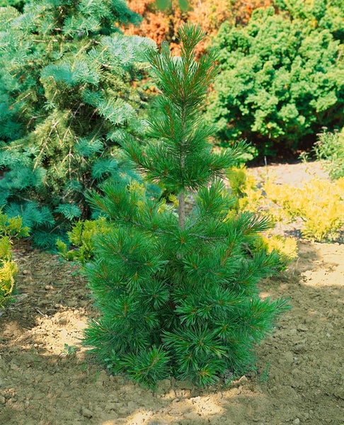 Pinus jeffreyi, die Jeffrey-Kiefer, ist eine imposante Konifere und attraktives Nadelgehölz mit charaktervollem Auftritt im Garten. Der immergrüne Nadelbaum zeigt lange, in Dreierbündeln stehende, blaugrün schimmernde Nadeln, die dem Ziergehölz eine edle, ruhige Anmutung verleihen. Im Frühjahr erscheinen unauffällige Blüten, gefolgt von dekorativen, großen Zapfen, während die im Alter schuppige, aromatisch duftende Borke zusätzliche Struktur bietet. Der Wuchs ist anfangs gleichmäßig pyramidal, später breitkronig mit klarer, malerischer Silhouette, ideal als Solitärgehölz für großzügige Beete und Rasenflächen. In Kombination mit anderen Koniferen, Heidekraut und Gräsern eignet sich die Jeffrey-Kiefer ebenso für Gruppenpflanzungen in Park- und Naturgärten oder als markanter Gartenbaum im Vorgarten. In jungen Jahren lässt sie sich auch als Kübelpflanze auf der Terrasse kultivieren, sofern ein ausreichend großes, gut drainiertes Pflanzgefäß verwendet wird. Ein vollsonniger, warmer Standort unterstreicht den kompakten, vitalen Wuchs, während durchlässige, sandig-humose bis leicht saure Böden ohne Staunässe bevorzugt werden. Die Pflege ist unkompliziert: gleichmäßige Wasserversorgung in der Anwuchsphase, später nur bei längerer Trockenheit gießen, sparsam düngen und auf Schnitt verzichten, da die Kiefer ihre natürliche Form am schönsten selbst entwickelt. Eine mineralische Mulchschicht aus Kies oder Splitt fördert die Wurzelgesundheit und betont den Charakter dieses robusten Zierbaums, der als Solitär, Gartenstrauch-Ersatz im Nadelgarten oder Teil eines zeitlosen Blüten- und Strukturensembles überzeugt.