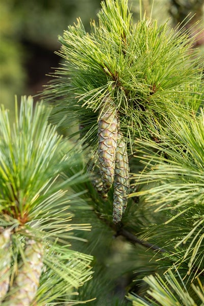 Pinus peuce, die Rumelische Kiefer, ist ein edles Nadelgehölz mit natürlicher Eleganz und ruhiger Ausstrahlung, das als immergrüner Gartenbaum ganzjährig Struktur und Farbe vermittelt. Die langen, weichen Nadeln stehen in Fünferbündeln und zeigen ein attraktives blaugrünes bis leicht silbriges Farbspiel, das besonders im Winter brilliert. Der Wuchs ist zunächst schlank kegelförmig und regelmäßig, später breiter und harmonisch aufgebaut, wodurch sich dieses Ziergehölz hervorragend als Solitär im Vorgarten, auf Rasenflächen oder als markanter Akzent im Stauden- und Gehölzbeet eignet. Unscheinbare Blüten werden von dekorativen, später bräunlichen Zapfen abgelöst, die die natürliche Anmut dieses Nadelbaums unterstreichen.