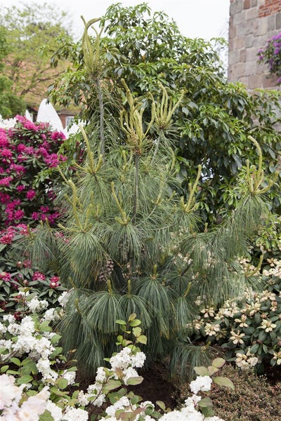 Pinus schwerinii, die Schwerin-Kiefer, ist ein elegantes immergrünes Nadelgehölz mit parkhafter Ausstrahlung und eignet sich als eindrucksvoller Gartenbaum für großzügige Anlagen. Die weichen, langen, blaugrünen Nadeln sitzen in Büscheln und verleihen dem Gehölz eine luftig-hängende Anmutung, die an Weymouth-Kiefer erinnert. Der Wuchs ist schlank bis breit kegelförmig mit harmonisch aufgebauten Etagenzweigen, im Alter imposant und dennoch formschön. Unauffällige Blütenkätzchen im Frühjahr entwickeln sich zu zierenden, länglichen Zapfen, die den natürlichen Charakter zusätzlich unterstreichen. Als Solitär setzt die Schwerin-Kiefer im Rasen, am Teichrand oder im Heide- und Steingarten markante Akzente, lässt sich aber auch in lockerer Gruppenpflanzung mit anderen Koniferen oder Ziergehölzen kombinieren, um strukturstarke Gartenbilder zu schaffen. In jungen Jahren kann sie in einem sehr großen Kübel auf Terrasse oder Hof als ausdrucksstarke Kübelpflanze eingesetzt werden; dauerhaft fühlt sie sich im Beet oder im frei wachsenden Gehölzstreifen am wohlsten und bietet ganzjährigen Sichtschutz. Bevorzugt werden sonnige bis absonnige Standorte mit durchlässigem, humosem bis sandig-lehmigem Boden; Staunässe sollte vermieden werden, ein leicht saurer pH fördert die schöne Nadel-Färbung. Die Pflege ist unkompliziert: Nach der Pflanzung gleichmäßig wässern, später nur in längeren Trockenphasen gießen, eine dünne Mulchschicht hält die Bodenfeuchte. Ein Schnitt ist in der Regel nicht nötig; lediglich trockene oder störende Triebe werden nach Bedarf entfernt. Robust, winterhart und windverträglich überzeugt Pinus schwerinii als charakterstarkes Ziergehölz für zeitlose Gartengestaltung.