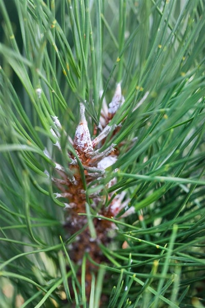 Pinus sylvestris ‘Fastigiata’, die Säulenform der heimischen Wald-Kiefer, präsentiert sich als elegantes, immergrünes Nadelgehölz für strukturstarke Gärten. Die Gemeine Kiefer in dieser schlanken Auslese wächst streng aufrecht, mit dicht anliegenden, nach oben strebenden Trieben und einer schmalen, säulenförmigen Silhouette. Blaugrüne bis graugrüne, paarweise stehende Nadeln sorgen ganzjährig für frische Farbe, während die später orangebraun schimmernde Rinde einen attraktiven Kontrast bietet. Im Frühjahr erscheinen unauffällige männliche Blütenstände, aus denen sich dekorative, hängende Zapfen entwickeln, die den natürlichen Charakter des Gehölzes unterstreichen. Als Solitär im Vorgarten setzt die Säulen-Kiefer markante Akzente, sie eignet sich ebenso für schmale Beete entlang von Wegen, für minimalistische Steingärten oder als strukturierende Komponente in der Gruppenpflanzung mit anderen Koniferen. In großen Gefäßen wird sie zur langlebigen Kübelpflanze auf Terrasse und Dachgarten; aufgrund des schlanken Wuchses bietet sie sich zudem als schmale Sichtschutz- oder Heckenpflanze an, wo wenig Platz vorhanden ist. Ein sonniger Standort fördert die dichte Belaubung und den kompakten Aufbau. Der Gartenboden sollte durchlässig, eher sandig bis mäßig nährstoffreich sein; Staunässe ist zu vermeiden, denn die Sorte schätzt trockene bis frische Bedingungen und zeigt sich windfest sowie frosthart. Pflegeleicht und schnittarm behält sie ihre Form von Natur aus; bei Bedarf lassen sich im Frühsommer die Neutriebe (“Kerzen”) leicht einkürzen, um die Säulenform noch klarer zu betonen und das Wachstum zu steuern.