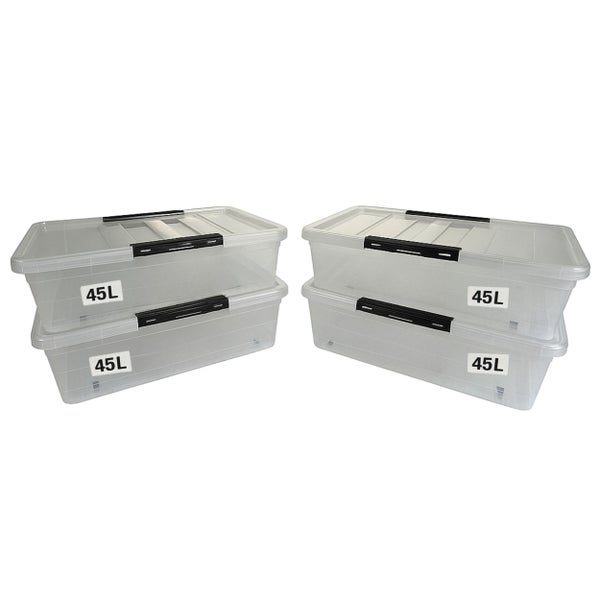 - Im Lieferumfang enthalten4 Aufbewahrungsboxen 45 Liter mit Deckel, Clips und Rollen