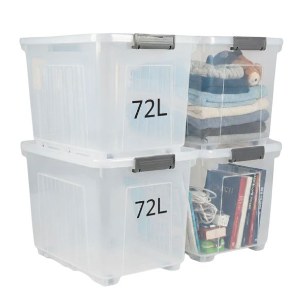 - Im Lieferumfang enthalten4 Aufbewahrungsboxen 72 Liter mit Deckel, Clips und Rollen