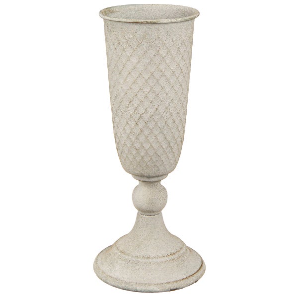 Diese edle Pokalvase aus Metall im Vintage-Design ist ein absolutes Highlight für Ihr Zuhause und passt perfekt zu den aktuellen Dekorationstrends. Die sanften Rundungen und das elegante Karo-Dekor verleihen diesem Deko-Objekt einen nostalgischen Charme. Der antike Look entsteht durch die grobe, strukturierte Oberfläche, die an ein Fundstück aus früheren Zeiten erinnert. Dieses Gefäß ist die ideale Wahl, wenn Sie Ihrem Wohnraum eine stimmungsvolle, stilvolle Note verleihen möchten. Dank seines zeitlosen Designs eignet sich die Vase hervorragend sowohl als Pflanzgefäß als auch als dekoratives Element auf Tischen, Sideboards oder Fensterbänken. Stellen Sie zarte Frühjahrsblüher wie Narzissen oder Vergissmeinnicht in die Vase und schaffen Sie einen intensiven Farbkontrast zur rustikalen Oberfläche. Die Pokalvase fügt sich ebenso harmonisch in ein Interieur im Landhausstil ein und macht als Blickfang bei festlichen Tischdekorationen eine besonders gute Figur. Gefertigt aus robustem Metall, besticht die Pokalvase durch ihre hochwertige Verarbeitung. Die verzinkte und nachbehandelte Oberfläche sorgt für Langlebigkeit, während die einzigartige Struktur ihre dekorative Wirkung unterstreicht. Beachten Sie beim Bepflanzen, das Gefäß mit einer Pflanzenfolie auszukleiden, um stehendes Wasser zu vermeiden. Die Vase bietet eine großzügige Pflanztiefe, die sich hervorragend für verschiedenste Blumen- und Pflanzendekorationen eignet. Kombinieren Sie die Vase mit weiteren dekorativen Elementen wie Kerzenleuchtern, anderen Vintage-Objekten oder Blumenarrangements, um ein harmonisches Gesamtbild zu erzeugen. Ob als Geschenkidee für Vintage-Liebhaber oder als eigenständiges Deko-Highlight – dieses dekorative Gefäß bereichert jedes Ambiente und schafft eine außergewöhnliche Wohlfühlatmosphäre. Anb.Nr.: 17303 EAN: 4067555173036