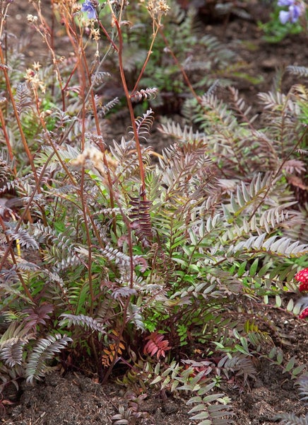 Polemonium yezoense ‘Purple Rain’, die elegante Jakobsleiter, verbindet zartes Blütenflair mit außergewöhnlichem Laubschmuck und bereichert als edle Zierstaude jedes Staudenbeet. Die filigran gefiederten Blätter treiben im Frühjahr in tief purpurbraunen bis schokoladigen Tönen aus, vergrünen im Sommer mit violettem Schimmer und formen einen kompakten, horstigen, buschigen Wuchs. Darüber schweben ab Mai bis Juni zahlreiche glockenförmige, lavendel- bis violettblau leuchtende Blüten in lockeren Rispen, die der Blütenstaude einen luftig-leichter Charakter verleihen. Mit einer Höhe von etwa 30 bis 45 cm bleibt sie angenehm kompakt und passt hervorragend an den Gehölzrand, in die Rabatte oder in den naturnahen Cottage-Garten.