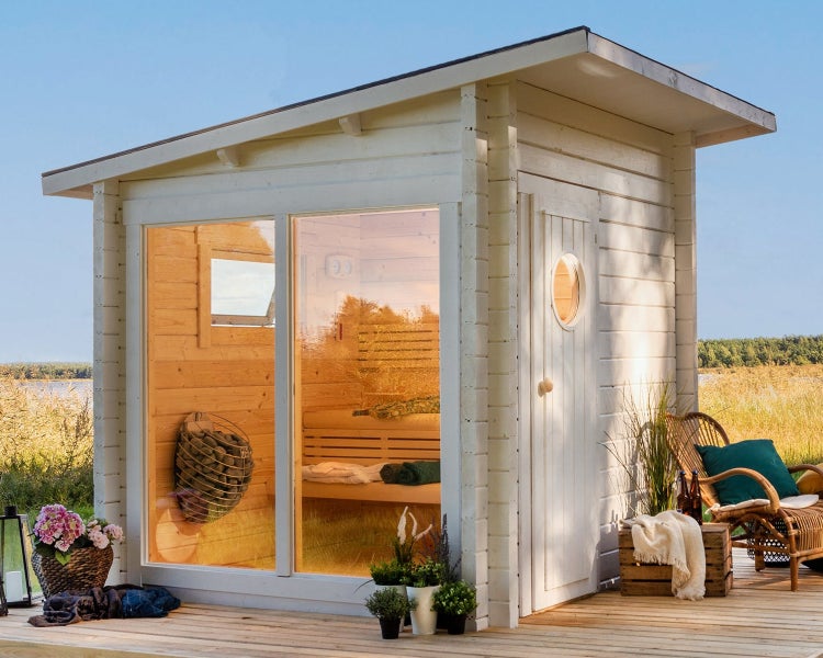 Hochwertiges Holz und das isolierte Glas der Fenster geben der Sauna einen luxoriösen Look.