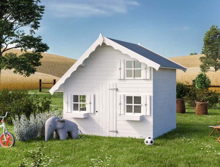 Das Spielhaus Tom ist ein entzückendes Miniaturhaus mit Boden, Fenstern, Fensterläden und Blumenkästen. Es verkörpert den Charme eines echten Ferienhauses, nur in kleinerer Ausführung.