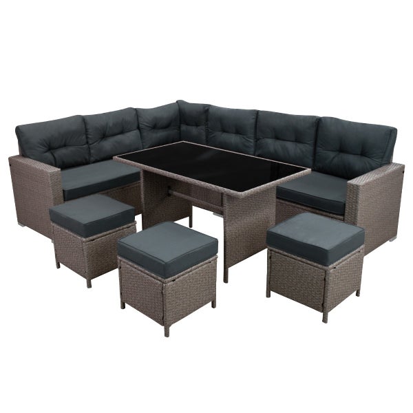 Dieses stilvolle und bequeme Set besteht aus einem Ecksofa, 3 Hockern und einem Tisch mit Glasplatte. Dieses Set bietet bequem Platz für neun Personen und ist der perfekte Mittelpunkt für jede Gartenparty oder ein Dinner in freier Natur.