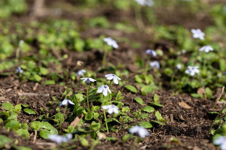 Pratia pedunculata, auch als Kriechendes Sternchen bekannt und unter den Synonymen Isotoma fluviatilis bzw. Lobelia pedunculata geführt, ist eine ausgesprochen feintriebige Polsterstaude, die als flacher Bodendecker bezaubernde, sternförmige, hellblaue bis zart violettblaue Blüten hervorbringt. Von späten Frühlingstagen bis in den Sommer hinein schmückt sie sich mit unzähligen Miniblüten über einem dichten Teppich aus winzigem, rundlichem, frischgrünem Laub. Der wuchsfreudige, kriechende Charakter bildet rasch geschlossene Matten von nur wenigen Zentimetern Höhe, ideal für den Steingarten, den Beetvordergrund, als Rasenersatz in wenig genutzten Bereichen oder als Fugenpflanze zwischen Trittplatten und Wegbegrenzungen. In Schalen, Trögen und Balkonkästen überzeugt das Blaue Sternchen ebenso als zierliche Kübelpflanze und setzt im Vorgarten dezente, elegante Akzente.