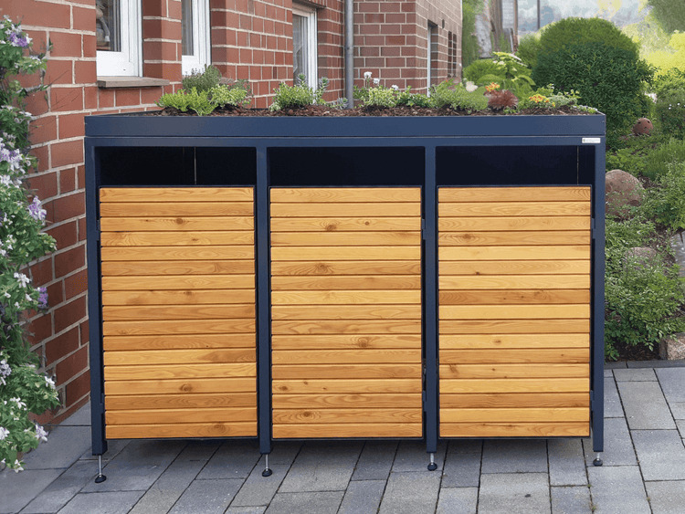 Produktinformationen 3er Holz Mülltonnenbox Premium mit Pflanzdach