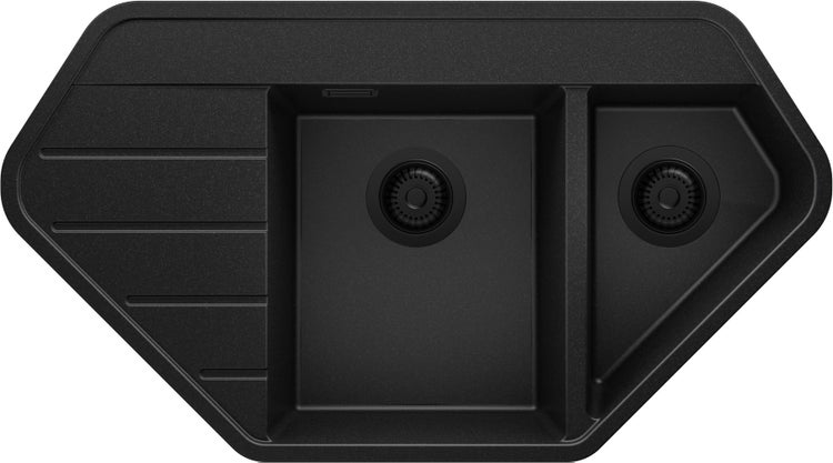 PRIMAGRAN Eckspüle Alles Schwarz 90x50cm, Granitspüle 1,5 Becken + Ablauf-Set, Küchenspüle ab 80er Unterschrank - Kopenhagen Corner