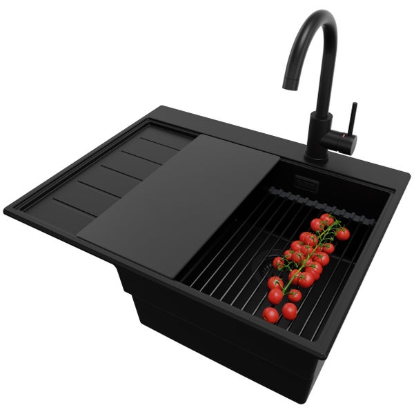PRIMAGRAN Granitspüle Alles Schwarz 62x50cm, Spülbecken 1 Becken + Küchenarmatur 32x20cm + Ablauf-Set + Küchenzubehörset, Küchenspüle ab 40er Unterschrank - Sydney