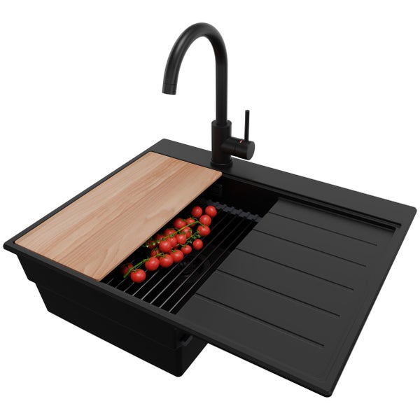PRIMAGRAN Granitspüle Alles Schwarz 62x50cm, Spülbecken 1 Becken + Küchenarmatur 32x20cm + Ablauf-Set + Küchenzubehörset, Küchenspüle ab 40er Unterschrank - Sydney