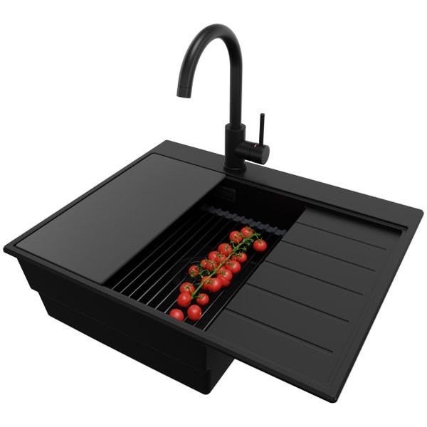 PRIMAGRAN Granitspüle Alles Schwarz 62x50cm, Spülbecken 1 Becken + Küchenarmatur 32x20cm + Ablauf-Set + Küchenzubehörset, Küchenspüle ab 45er Unterschrank - Sydney