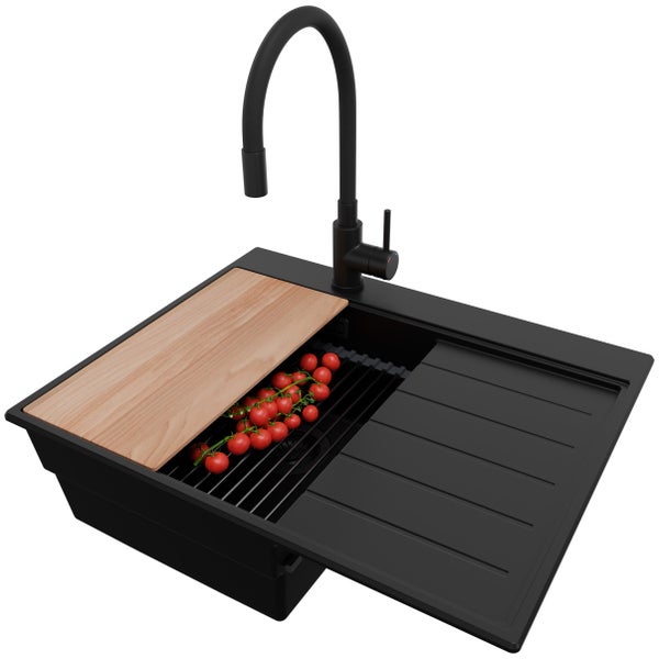 PRIMAGRAN Granitspüle Alles Schwarz 62x50cm, Spülbecken 1 Becken + Küchenarmatur 40x38cm + Ablauf-Set + Küchenzubehörset, Küchenspüle ab 40er Unterschrank - Sydney