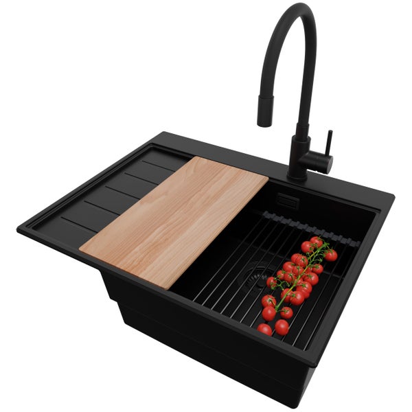 PRIMAGRAN Granitspüle Alles Schwarz 62x50cm, Spülbecken 1 Becken + Küchenarmatur 40x38cm + Ablauf-Set + Küchenzubehörset, Küchenspüle ab 45er Unterschrank - Sydney
