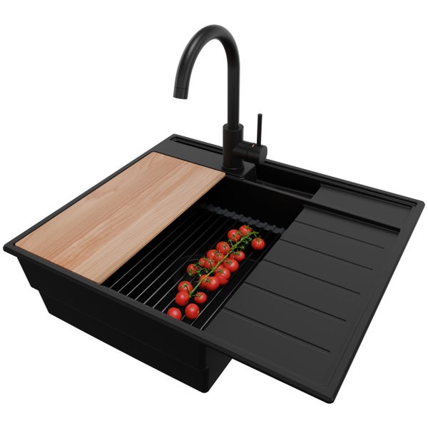 PRIMAGRAN Granitspüle Alles Schwarz 62x53cm, Spülbecken 1 Becken + Küchenarmatur 32x20cm + Ablauf-Set + Küchenzubehörset, Küchenspüle ab 45er Unterschrank - Sydney Pocket