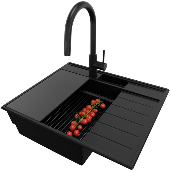 PRIMAGRAN Granitspüle Alles Schwarz 62x53cm, Spülbecken 1 Becken + Küchenarmatur 40x20cm + Ablauf-Set + Küchenzubehörset, Küchenspüle ab 45er Unterschrank - Sydney Pocket