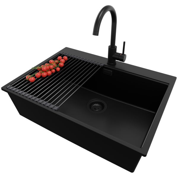 PRIMAGRAN Granitspüle Alles Schwarz 68x50cm, Spülbecken 1 Becken + Küchenarmatur 32x20cm + Ablauf-Set + Aufrollbare Abtropffläche, Küchenspüle ab 70er Unterschrank - Oslo