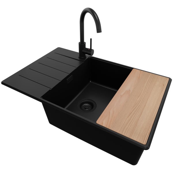 PRIMAGRAN Granitspüle Alles Schwarz 78x50cm, Spülbecken 1 Becken + Küchenarmatur 32x20cm + Ablauf-Set + Schneidebrett, Küchenspüle ab 60er Unterschrank - Kopenhagen