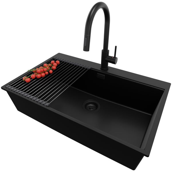 PRIMAGRAN Granitspüle Alles Schwarz 78x50cm, Spülbecken 1 Becken + Küchenarmatur 40x20cm + Ablauf-Set + Aufrollbare Abtropffläche, Küchenspüle ab 80er Unterschrank - Oslo