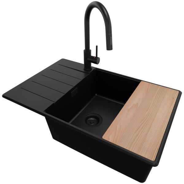 PRIMAGRAN Granitspüle Alles Schwarz 78x50cm, Spülbecken 1 Becken + Küchenarmatur 40x20cm + Ablauf-Set + Schneidebrett, Küchenspüle ab 60er Unterschrank - Kopenhagen