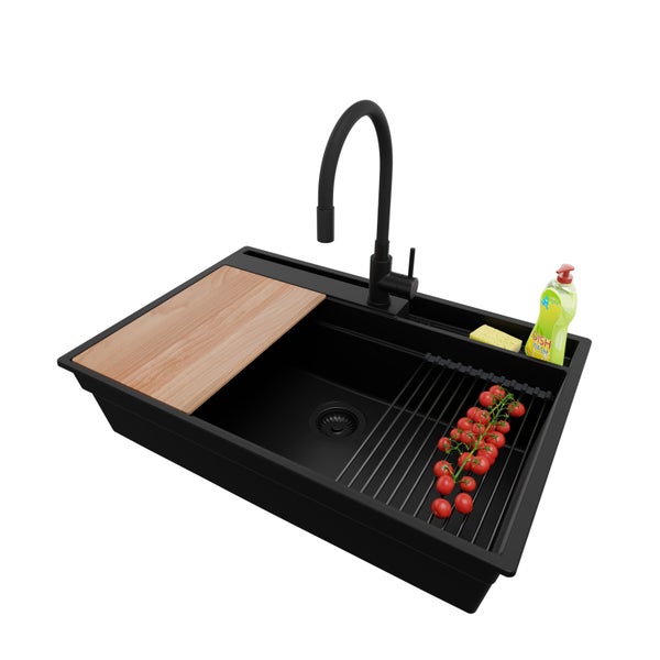 PRIMAGRAN Granitspüle Alles Schwarz 78x53cm, Spülbecken 1 Becken + Küchenarmatur 40x38cm + Ablauf-Set + Küchenzubehörset, Küchenspüle ab 80er Unterschrank - Oslo Pocket