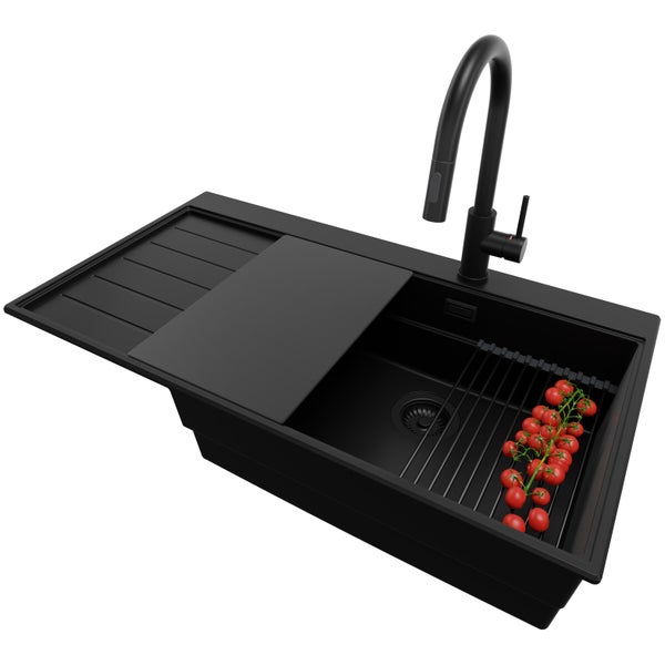 PRIMAGRAN Granitspüle Alles Schwarz 90x50cm, Spülbecken 1 Becken + Küchenarmatur 40x20cm + Ablauf-Set + Küchenzubehörset, Küchenspüle ab 60er Unterschrank - Sydney