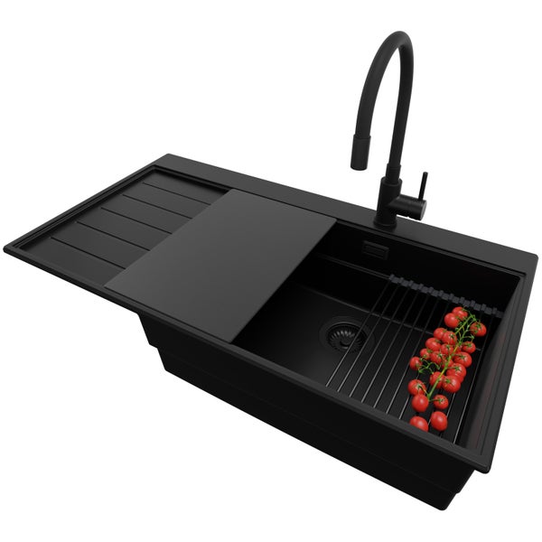 PRIMAGRAN Granitspüle Alles Schwarz 90x50cm, Spülbecken 1 Becken + Küchenarmatur 40x38cm + Ablauf-Set + Küchenzubehörset, Küchenspüle ab 60er Unterschrank - Sydney