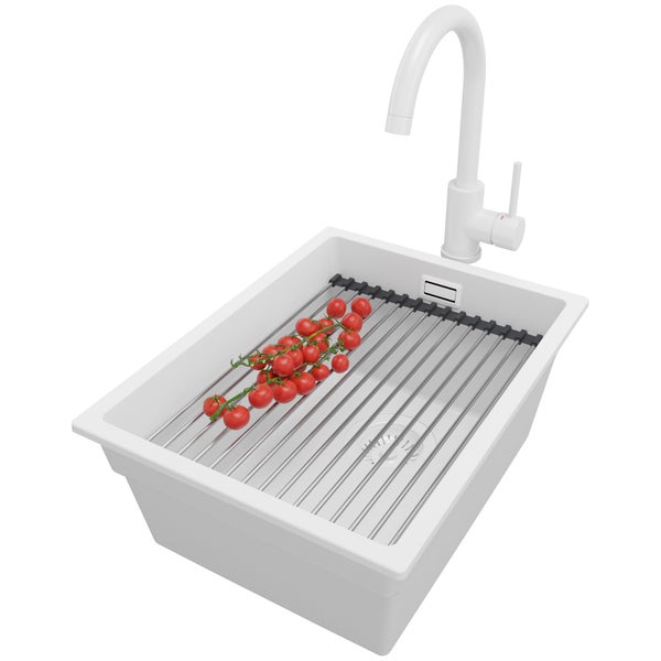 PRIMAGRAN Granitspüle Alles Weiß 36x47cm, Spülbecken 1 Becken + Küchenarmatur 32x20cm + Ablauf-Set + Aufrollbare Abtropffläche, Küchenspüle ab 40er Unterschrank - Praga Slim