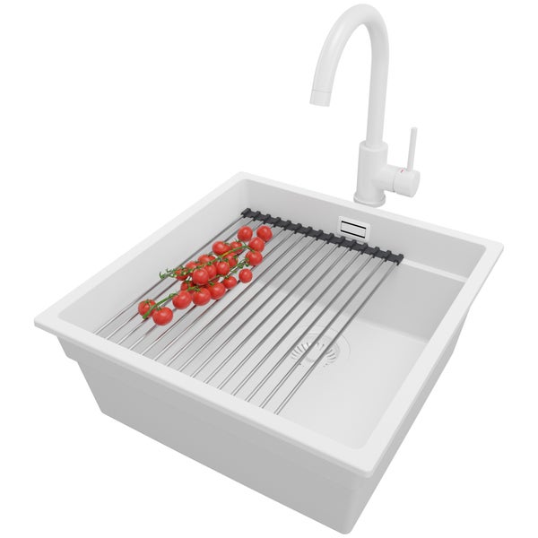 PRIMAGRAN Granitspüle Alles Weiß 46x47cm, Spülbecken 1 Becken + Küchenarmatur 32x20cm + Ablauf-Set + Aufrollbare Abtropffläche, Küchenspüle ab 50er Unterschrank - Praga Slim