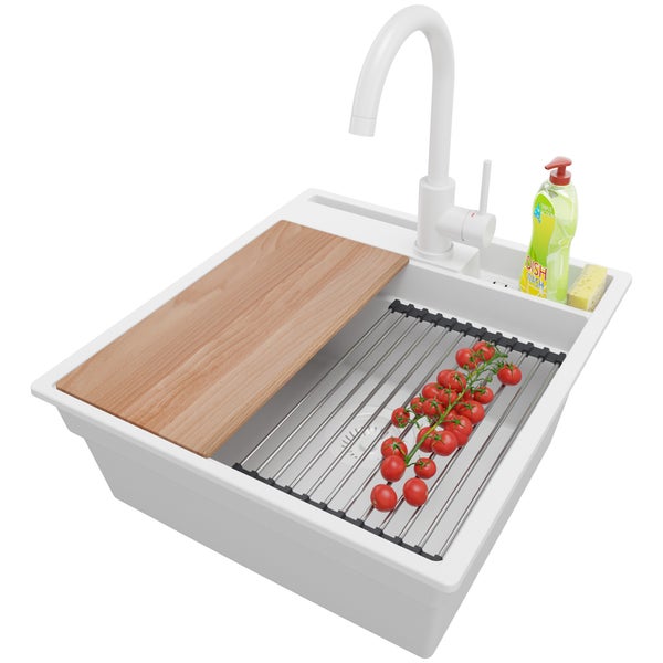 PRIMAGRAN Granitspüle Alles Weiß 48x53cm, Spülbecken 1 Becken + Küchenarmatur 32x20cm + Ablauf-Set + Küchenzubehörset, Küchenspüle ab 50er Unterschrank - Oslo Pocket