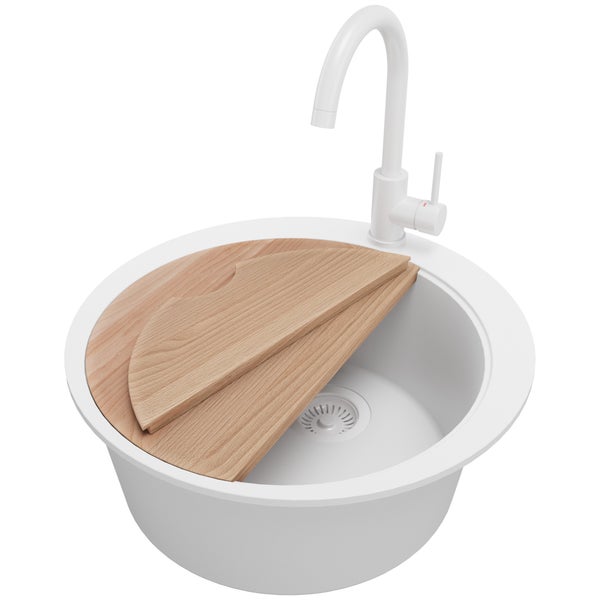 PRIMAGRAN Granitspüle Alles Weiß 53x53cm, Spülbecken Rund 1 Becken + Küchenarmatur 32x20cm + Ablauf-Set + Schneidebrett, Küchenspüle ab 50er Unterschrank - Pisa Max