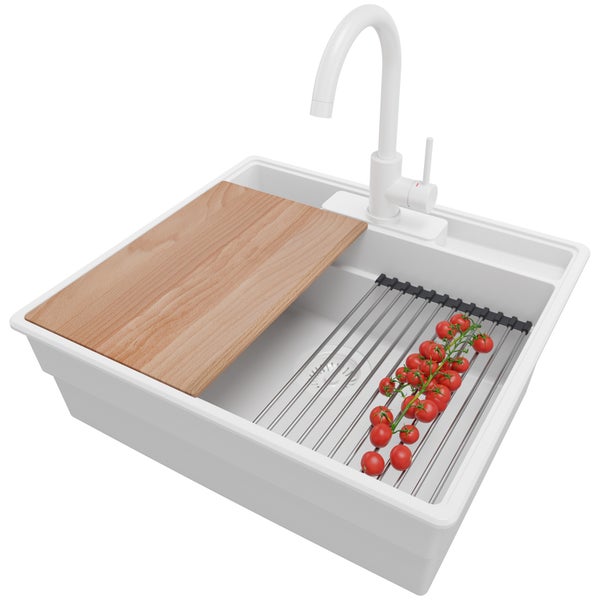 PRIMAGRAN Granitspüle Alles Weiß 58x53cm, Spülbecken 1 Becken + Küchenarmatur 32x20cm + Ablauf-Set + Küchenzubehörset, Küchenspüle ab 60er Unterschrank - New York