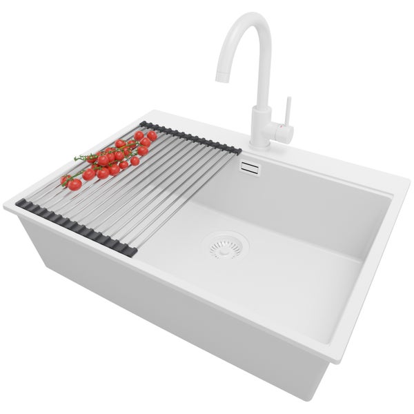 PRIMAGRAN Granitspüle Alles Weiß 68x50cm, Spülbecken 1 Becken + Küchenarmatur 32x20cm + Ablauf-Set + Aufrollbare Abtropffläche, Küchenspüle ab 70er Unterschrank - Oslo