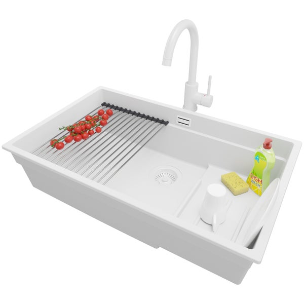 PRIMAGRAN Granitspüle Alles Weiß 76x47cm, Spülbecken 1 Becken + Küchenarmatur 32x20cm + Ablauf-Set + Aufrollbare Abtropffläche, Küchenspüle ab 80er Unterschrank - Praga Slim
