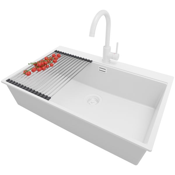 PRIMAGRAN Granitspüle Alles Weiß 78x50cm, Spülbecken 1 Becken + Küchenarmatur 32x20cm + Ablauf-Set + Aufrollbare Abtropffläche, Küchenspüle ab 80er Unterschrank - Oslo