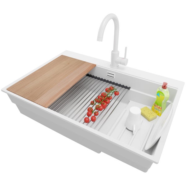 PRIMAGRAN Granitspüle Alles Weiß 78x53cm, Spülbecken 1 Becken + Küchenarmatur 32x20cm + Ablauf-Set + Küchenzubehörset, Küchenspüle ab 80er Unterschrank - Oslo Max