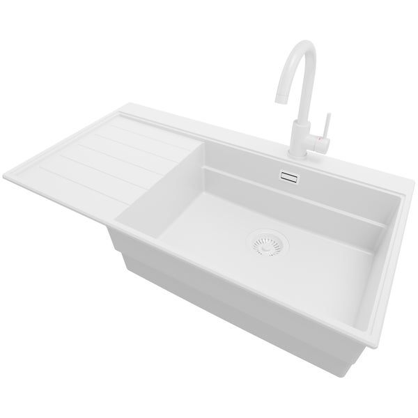 PRIMAGRAN Granitspüle Alles Weiß 90x50cm, Spülbecken 1 Becken + Küchenarmatur 32x20cm + Ablauf-Set, Küchenspüle ab 60er Unterschrank - Sydney