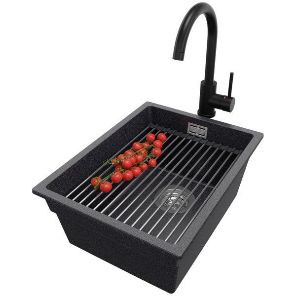 PRIMAGRAN Granitspüle Anthrazit 36x47cm, Spülbecken 1 Becken + Küchenarmatur 32x20cm + Ablauf-Set + Aufrollbare Abtropffläche, Küchenspüle ab 40er Unterschrank - Praga Slim