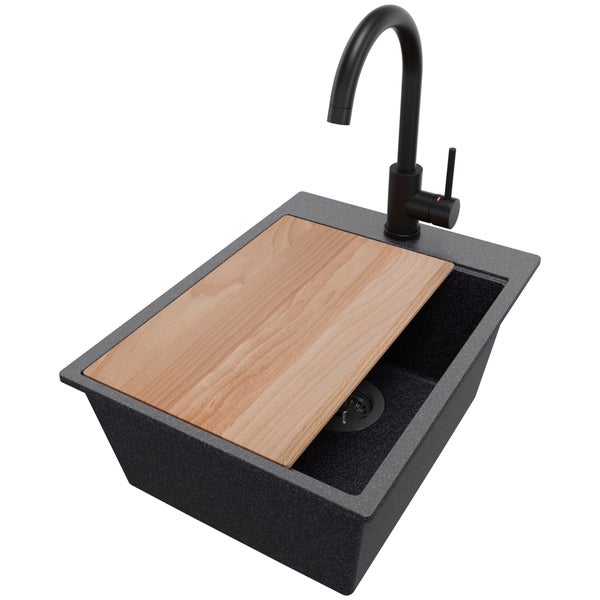 PRIMAGRAN Granitspüle Anthrazit 38x50cm, Spülbecken 1 Becken + Küchenarmatur 32x20cm + Ablauf-Set + Schneidebrett, Küchenspüle ab 40er Unterschrank - Oslo
